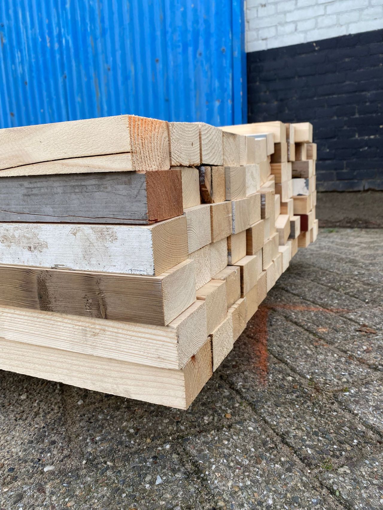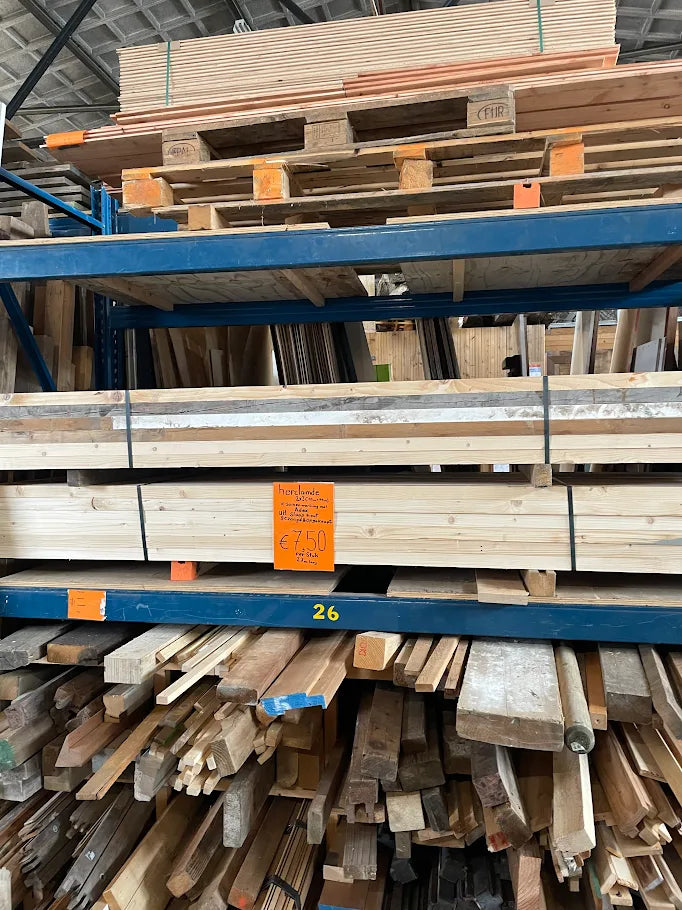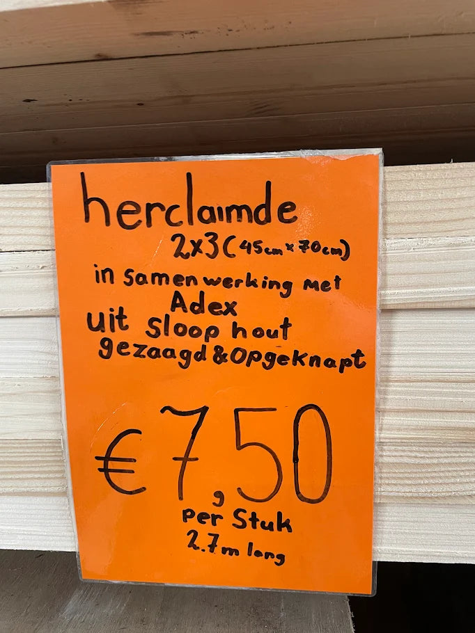 Dit hout is iets duurder dan nieuw hout. Dat verschil zit in de handmatige arbeid die nodig is voor demontage, inspectie en verwerking. Je betaalt niet alleen voor hout, maar voor herkomst, kwaliteit en meetbare impact.